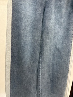 アシンメトリーなサイドラインのスウェット生地切り替えデニムパンツになります。